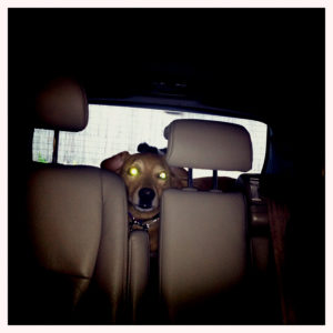 Turning Coco into a couch pretty much did it, and then for the next three days we would laugh and laugh and laugh as Chuck and Coco measured each and every single one of their actions against WHAT WILL KADIE THINK? I’d open the back door to let them out after a meal and both of them would sit there cowering, eyes darting, waiting for Kadie to walk out first. If all three of them were in the same room together, Chuck and Coco would huddle up in a corner, their backs facing out. Once Coco walked into the kitchen, saw Kadie sitting next to me at the table, and I kid you not, she walked along the wall, almost hugging it, until she got about ten feet away. And then she sat down, rolled onto her back and played dead.
